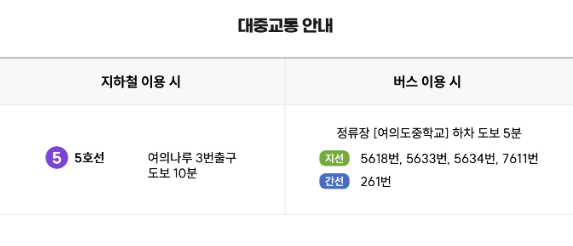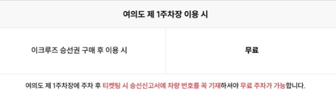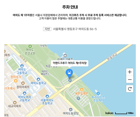 - 주차장: 이랜드크루즈 여의도 제1주차장 이용 가능.