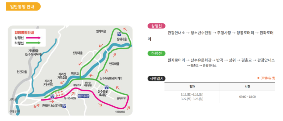 - 주차장: 산수유마을 인근 임시 주차장 및 지리산온천 공영주차장 이용.